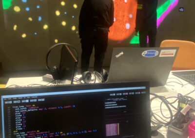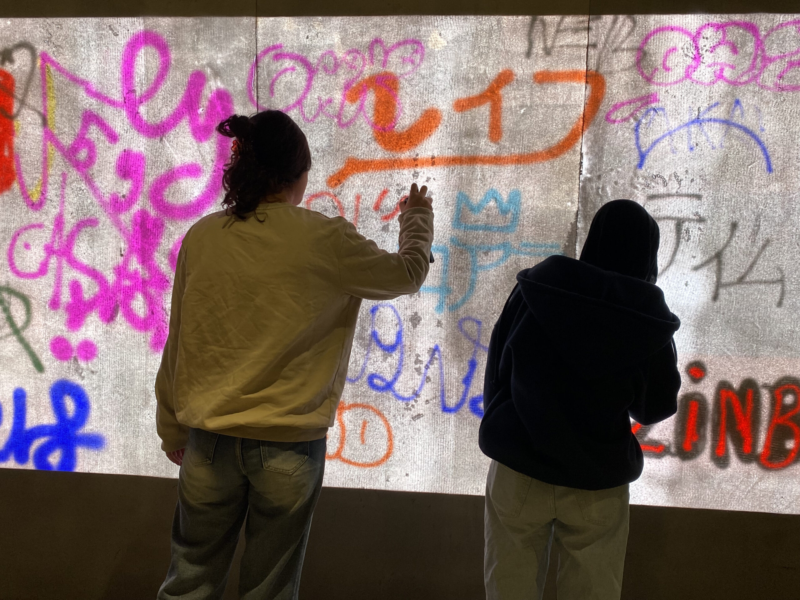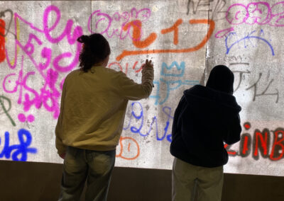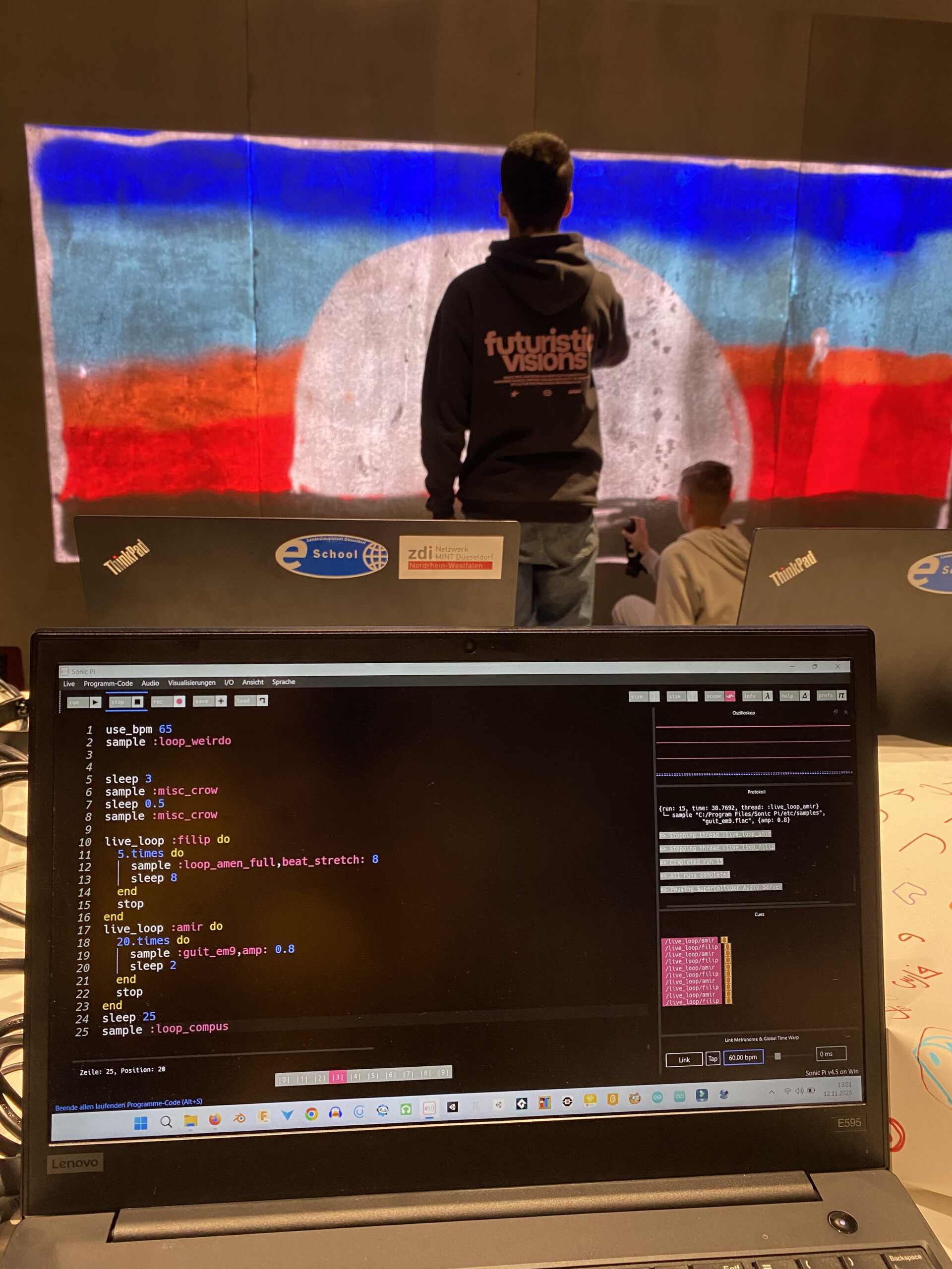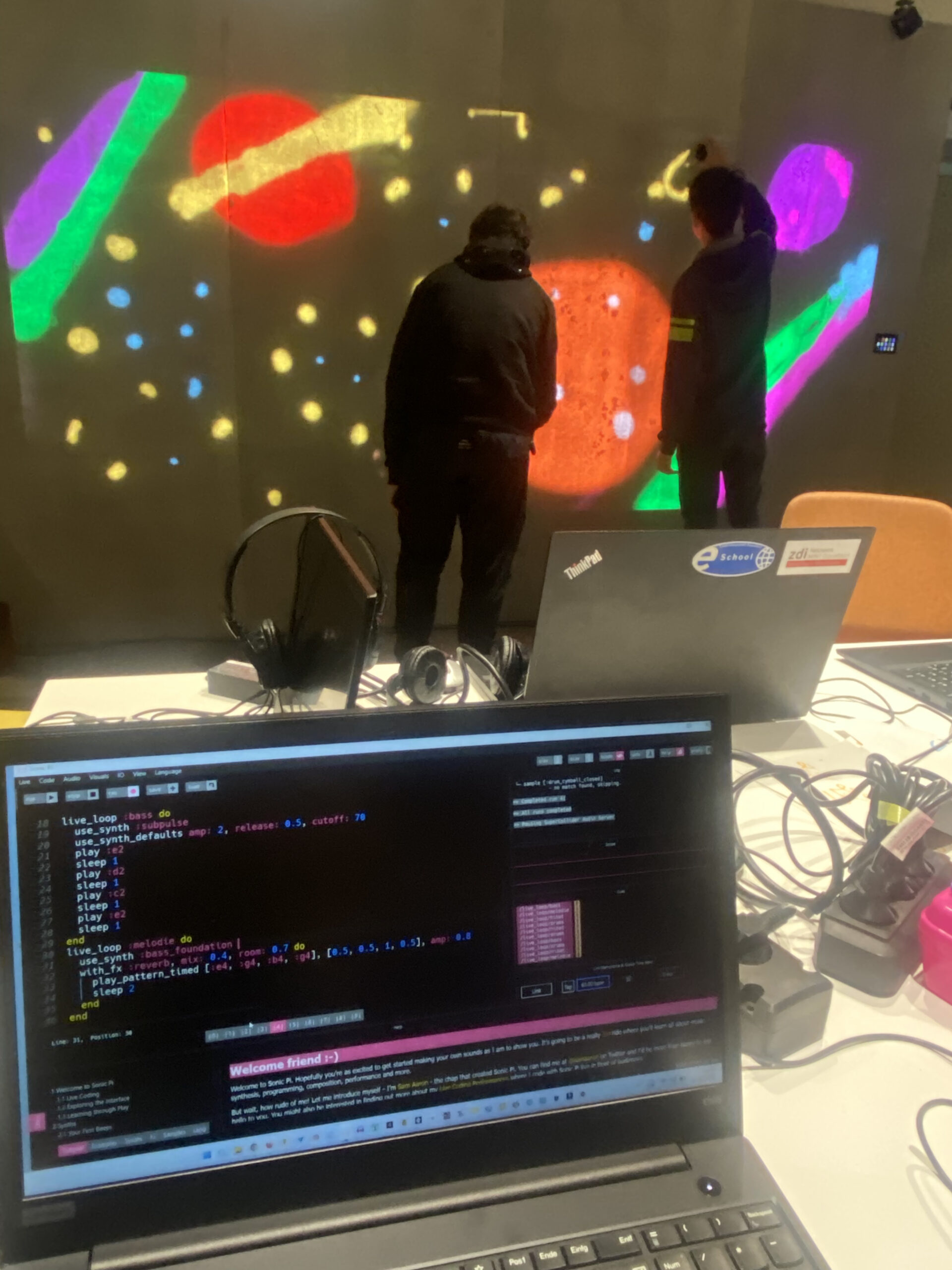 Die beiden anderen Kurse waren neu oder etwas überarbeitet im Programm. So trafen sich 21 Jugendliche in der Zentralen Stadtbibliothek im KAP1 an der digitalen Graffiti-Wand und hatten die Gelegenheit eigene Tags und dann ein ganzes Graffiti zu entwickeln, für welches schließlich mithilfe von Sonic Pi ein passendes Audio erstellt wurde.