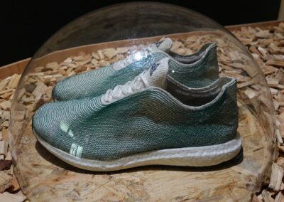 Ein echtes Highlight war der BEN&JERRY Schuh, dessen bunte und auffällige Gestaltung sofort unsere Blicke erregte. Durch die Verbindung zur bekannten Eismarke sorgte es bei uns für viele Lacher. Besonders interessant fanden wir auch die nachhaltigen Ansätze, die viele der ausgestellten Schuhe verfolgten. So gab es zum Beispiel einen Sneaker, der aus recycelten Fischernetzen hergestellt wurde. Diese coole Idee zeigt, wie man Kreativität und Umweltschutz verbinden kann.