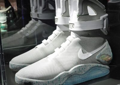 Besonders beeindruckt hat uns der Nike Mag aus dem Film „Zurück in die Zukunft II“ (1989). Dieser Schuh wurde durch die im Film dargestellten selbstschnürenden Schnürsenkel berühmt. Der Schuh hat ein sehr futuristisches Design und wurde 2016 in einer limitierten Auflage von nur 92 Paaren als Sammlerstück veröffentlicht. Aufgrund der starken Limitierung liegt der Verkaufspreis dieses Schuhs bei StockX über 60.000 Euro.