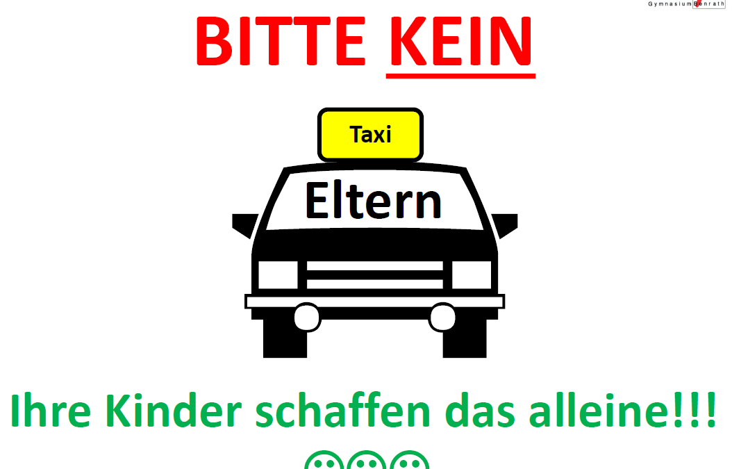 Bitte überdenken Sie noch einmal, ob die Fahrt mit dem Auto zur Schule überhaupt notwendig ist, die meisten Kinder sind in der Lage den Schulweg alleine zu bewältigen. Helfen Sie mit, dass die Schule ein sicherer Ort bleibt. Danke.