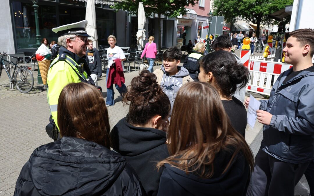 Mit den auf dieser Grundlage erstellten Informationsbroschüren und Infotafeln gingen sie am 8. Mai in der Benrather Innenstadt mit den Passanten ins Gespräch. Dabei ergaben sich unterschiedliche und oft intensivere Gespräche und damit eine für die Schülerinnen und Schüler eine gute Erfahrung von Sinnhaftigkeit und Wirksamkeit ihres Tuns.