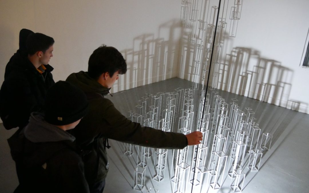 Auch die Installation von Feng Li mit einem Lichtpendel vor einer Gruppe von Gitterstehlen faszinierte viele SchülerInnen durch das komplexe Licht-Schatten-Gefüge.