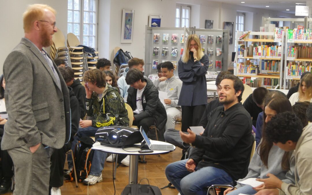 Danach startete er direkt mit dem ersten seiner Gedichte und schaffte es durch seine betonte und laute Ausdrucksweise, die von Gestik und Mimik untermauert wurde, unsere Aufmerksamkeit zu erhalten. Mir persönlich zeigte er dabei noch einmal, was für ein „Werkzeug“ unsere Stimme sein kann. Auch durch seine, an die jeweiligen Situationen angepassten Bewegungen, erschuf er Spannung und Dynamik. Die an passender Stelle eingebetteten Gespräche, wurden dabei vor allem genutzt, um etwas darüber zu erfahren, wie ein Dichterleben in der aktuellen Gesellschaft aussieht. Wir erfuhren so beispielsweise, dass Herr Crauss selbst jahrelang Tagebuch schrieb und sich nun zu ihm inspirierenden Erlebnissen Notizen anfertigt, die er dann später in seinen Gedichten einbringen kann. Zudem erfuhren wir im Kontext der Lesung, dass er selbst gerne unterwegs ist und beruflich bedingt schon in Berlin, Paris und Wien war. Aber auch Themen, wie beispielsweise das Gendern in der Sprache, fanden ihren Platz in den Schüler*innenfragen.