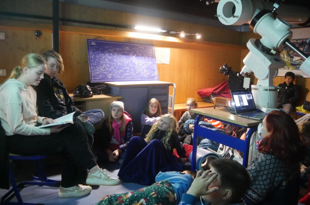 Kuschlig eingehüllt in Decken und Schlafsäcke und versorgt mit Keksen, Mandarinen und Tee hatten es sich die Fünftklässler in der Sternwarte des Gymnasiums bequem gemacht und lauschten den beiden Vorleserinnen Miriam Pfelzer und Clara Syldath, die aus dem Roman von Iris Abendschön vortrugen.