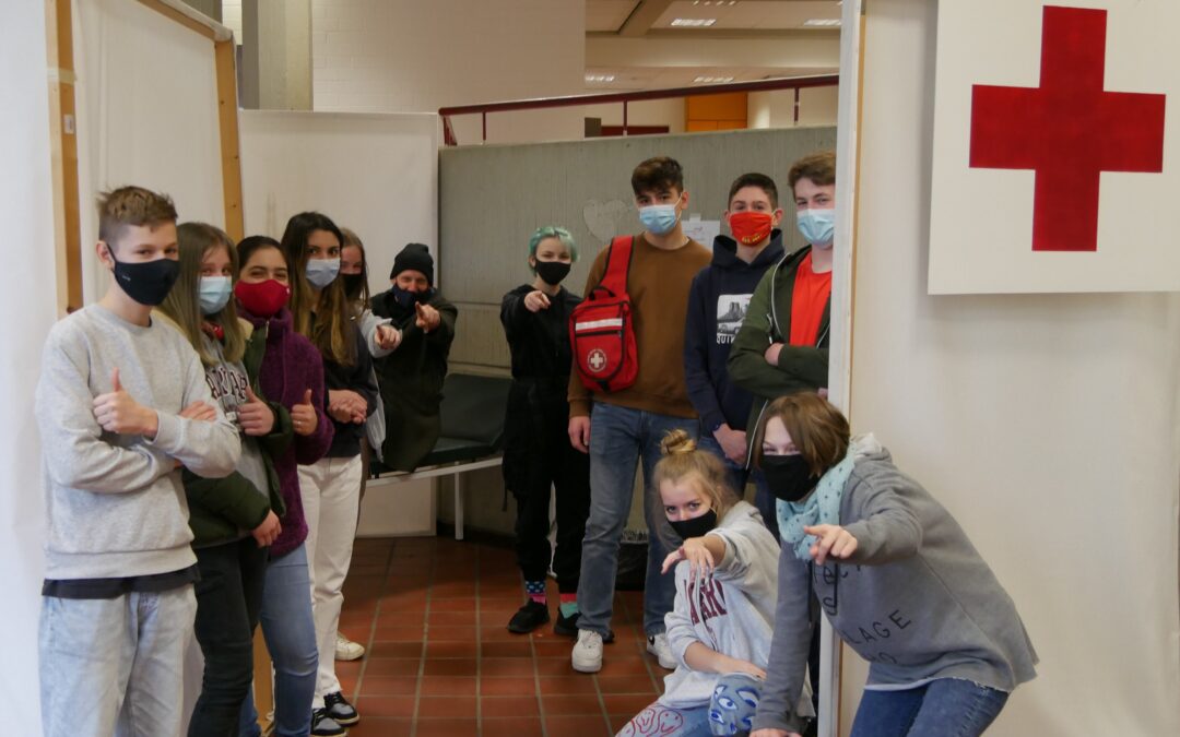 Für dieses Engagement wurden unsere Schulsanitäter nun vom DRK ausgezeichnet. Der Landesverband Nordrhein e.V. hatte im Rahmen des Welt-Erste-Hilfe-Tags zur Einsendung von Fotos zum Schulsanitätsdienst unter Corona-Bedingungen aufgerufen. Für ihr Foto gab es einen dritten Platz und eine Einkaufsgutschein in Höhe von 100 €.