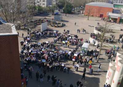 Am Freitag haben sich die Realschule Benrath und das Schloß-Gymnasium daher zusammengetan und friedlich auf dem Schulhof demonstriert. Hierbei wurde ein großes, menschliches „Peace“-Zeichen gebildet und mit selbst gebastelten Plakaten Solidarität zur Ukraine sowie eine klare Haltung gegen Krieg auf der ganzen Welt gezeigt.